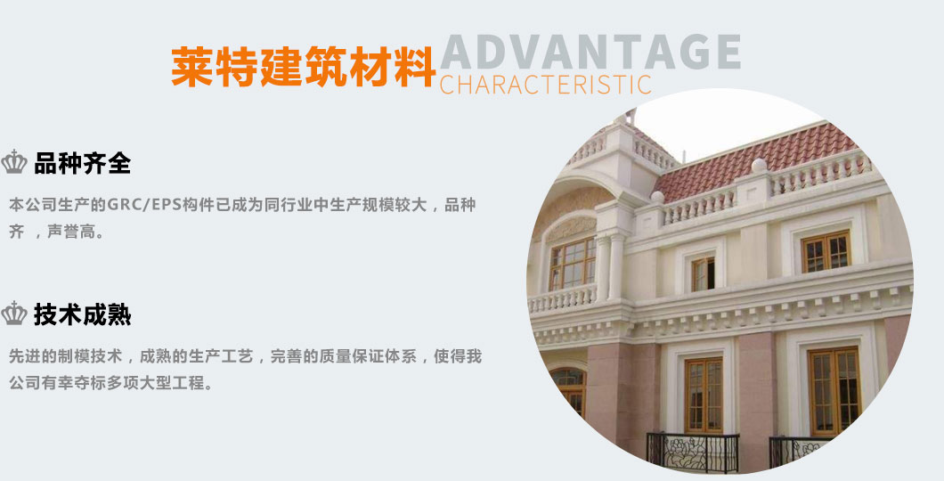 EPS/GRC產(chǎn)品是目前主導(dǎo)外墻裝飾的新型綠  色 環(huán) 保材料。較預(yù)制模板繁瑣的施工程序和高額的施工成本,更適用于安裝于外墻EPS,XPS保溫的墻體上。即能體現(xiàn)歐式、古典、高雅的裝飾風(fēng)格,又能保 證主體建筑外墻不出現(xiàn)冷、熱橋效應(yīng)。
